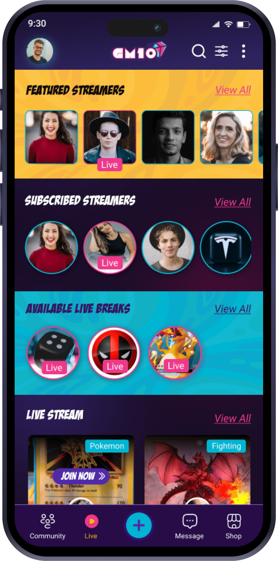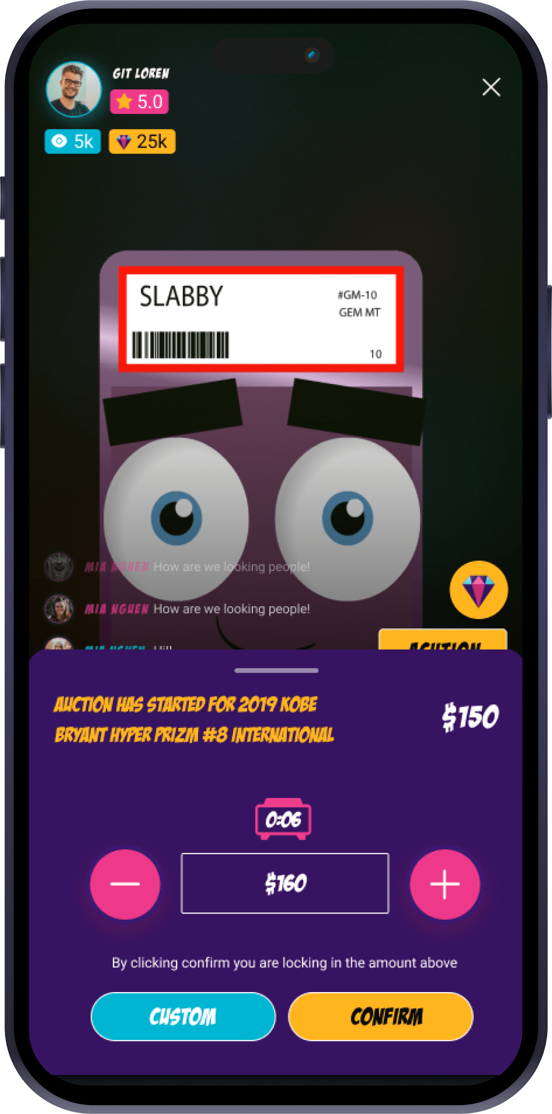 Our app unites collectors, sellers, and fans on a seamless platform, making live sports card breaks exciting, transparent, and secure for bidding, selling, and viewing.