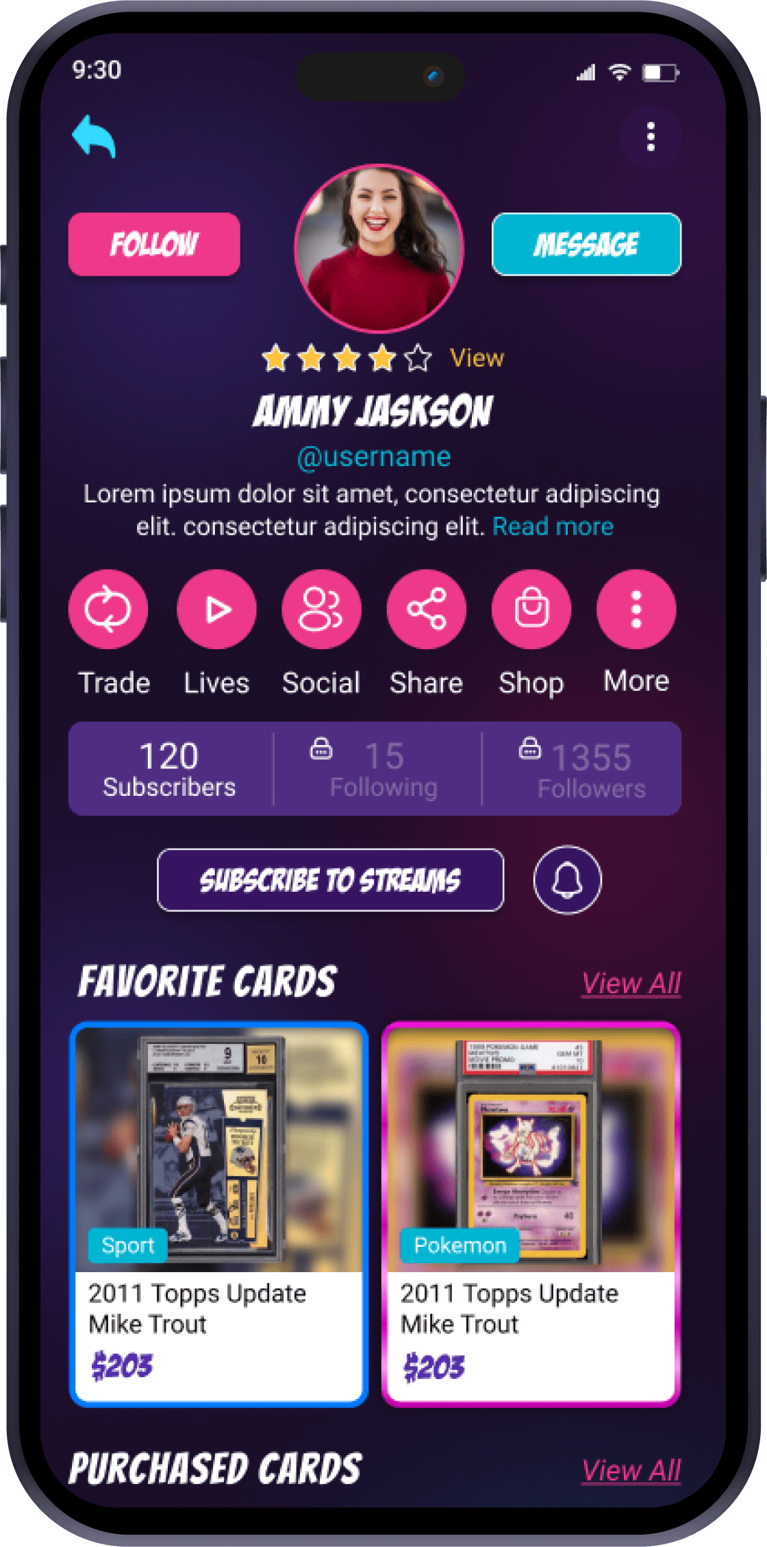 Our social trading card that provides a secure, all-in-one platform that unites collectors, sellers, and brands with community-focused tools. It offers a sleek marketplace for buying and selling, live auctions and interactive breaks to boost engagement, detailed pricing analytics, and safe trading features to reduce scams. Brand Shops enable businesses to grow and collaborate, while personalized profiles foster connections and trust. The platform combines nostalgia with modern convenience, making collecting fun, transparent, and profitable for everyone involved.